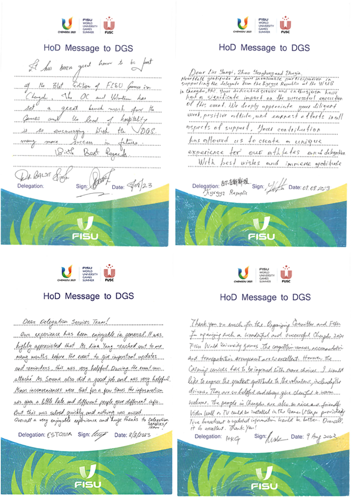 随着大运会的落幕,777盛世国际国际代表团服务团队凭借着及时高效的响应速度、热情专业的接待能力,取得了上百个代表团的盛赞,并收到了近70封代表团团长亲笔手写的表扬信。他们感谢代表团服务团队的工作,感谢3年来的沟通和10多天的陪伴,更感谢把他们当做朋友,与他们共同庆祝代表团取得的成绩。